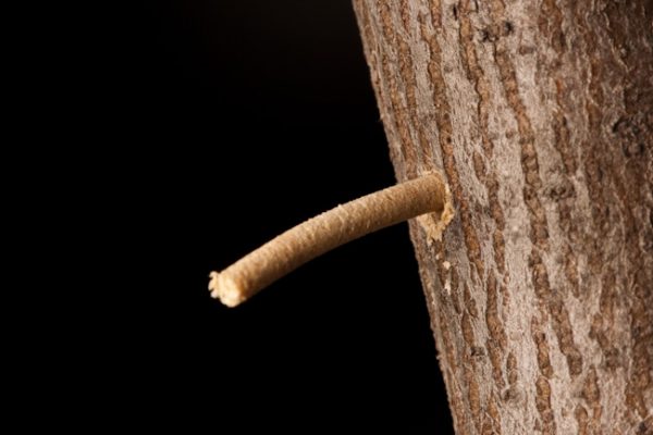Sixty million years before humans developed agriculture, three groups of insects had evolved the ability to grow fungi as a food source. A University of Texas study points out that some of the most ubiquitous insects of today, ants, termites and ambrosia beetles, became “dominant players in natural ecosystems” due to their ability to cultivate their own food (Mueller and Gerardo, 2002). The ambrosia beetle uses a specialized organ on it’s abdomen to store and transport fungal spores. When a female beetle finds a suitable host, she excavates a small (2-3mm) hole through the bark and deep into the trunk or buttress roots of the tree. Once inside, the beetle plants a species of the ambrosia fungus, which provides its food source. A common misconception is that the excavation of galleries in the trunk is the cause of tree death. In fact, the real problem is the ambrosia fungus. As it grows, the fungus clogs up the conductive xylem of the tree, limiting water and nutrient movement into the canopy. To compound the problem, the successful ambrosia beetle will emit pheromones that attract additional beetles to the tree.