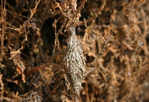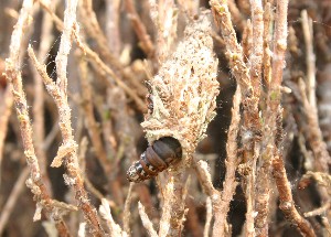 Once a larva has eaten enough to satisfy it, it attaches itself to a branch or nearby surface to pupate into the adult moth. Males emerge from their bags, females do not. Males mate with females, who lay their eggs in the bag, protected from winter cold and pesticides.