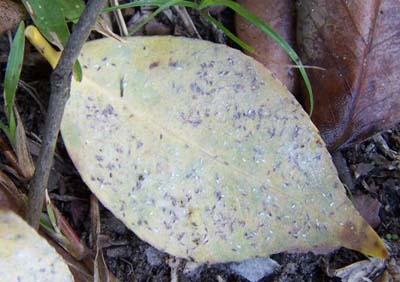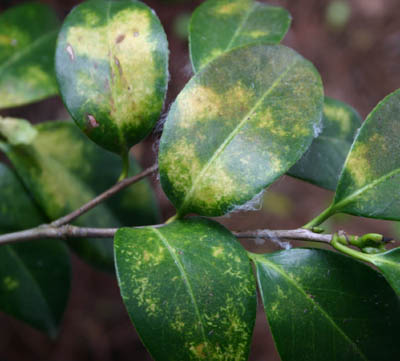 A second insect is causing the massive leaf drop: tea scale. These sucking insects get their name from the fact that tea is made from one species of camellia. The scale insects attach themselves to the underside of leaves and suck cell juice, leading to a mottled appearance on the upper side.