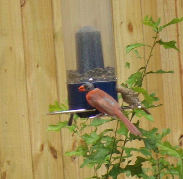 Q: I’m concerned about a female cardinal that has frequented my backyard feeder. She is completely bald from the shoulders up! What do you think is the trouble?