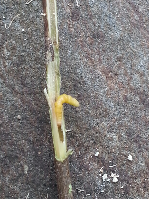 As the grub bores downward, the stem dies and wilts above the area girdled by the female beetle. Sawdust and waste is pushed out of holes along the stem.