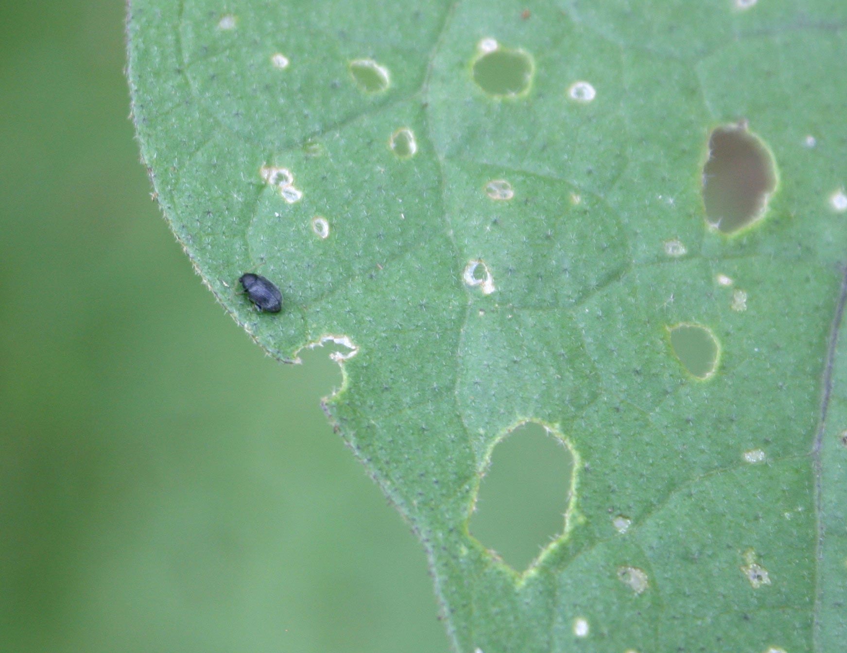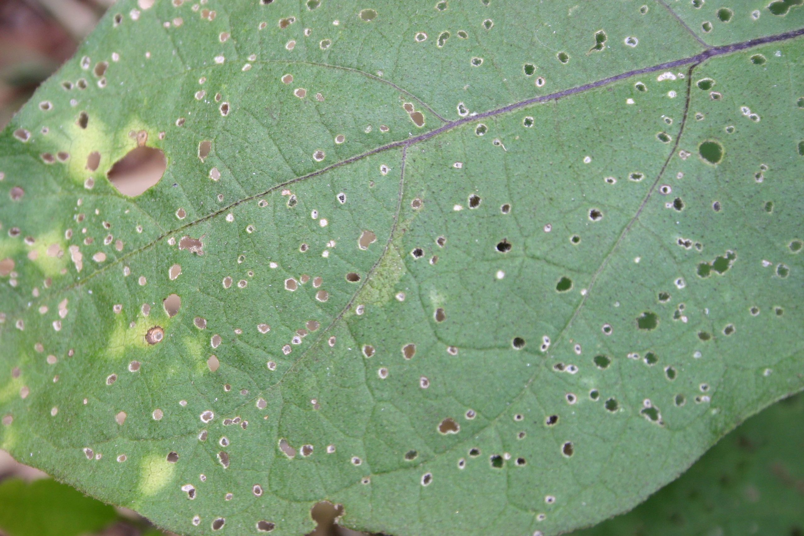 A: It’s flea beetle damage. They attack radish and mustard leaves too, but eggplant seems to be their favorite food in my garden.