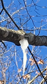 A: My bet is a squirrel stopped for a snack and chewed on the tree limb, which caused sap to drip out. Tree sap has a slightly lower freezing temperature than water but we’ve had temperatures below freezing for several days.