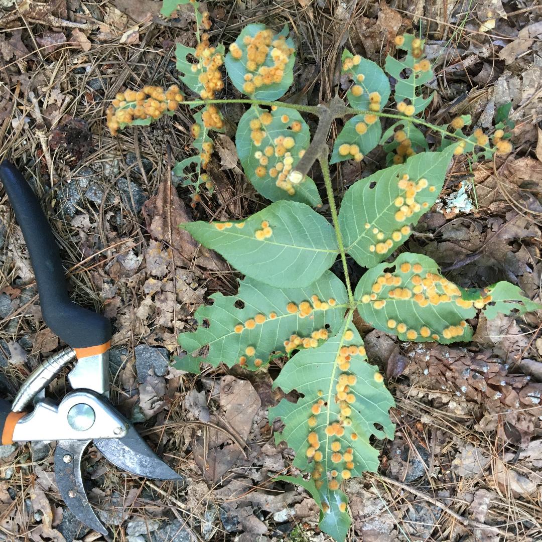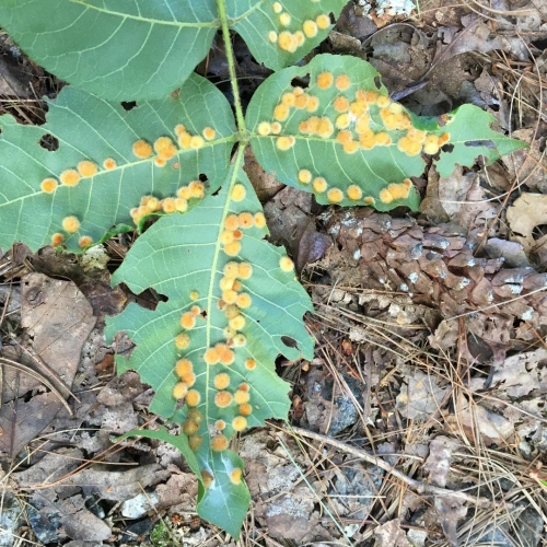 Fuzzy orange galls on leaf