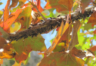 I looked up to the 20ft Nuttall oak that hangs over it and noticed they were buzzing around it too. I noticed little critters all over a couple of the woody branches of the oak tree. Could these be aphids? Will they do my tree any harm?
