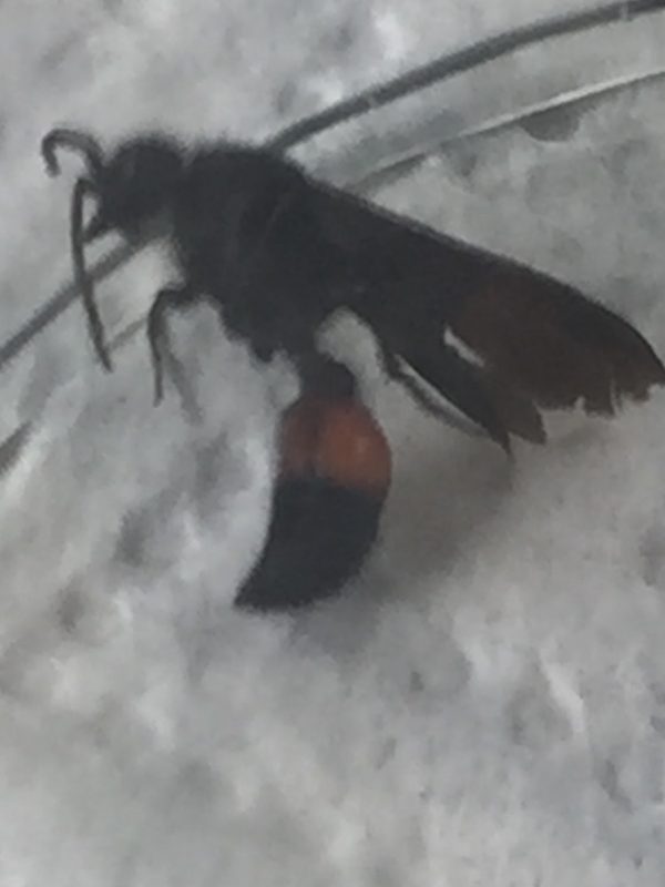A: They are golden digger wasps. They feed on crickets, grasshoppers and katydids and are considered beneficial insects. They are not aggressive so I would simply leave them alone as they do their work.