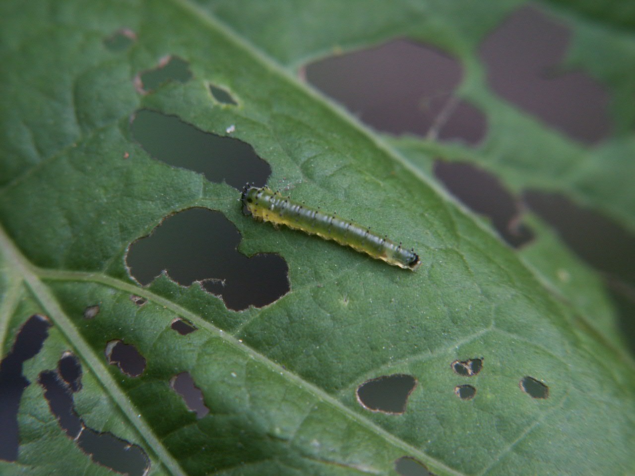 A sawfly adult is a primitive wasp-like insect. The females have a saw-like blade at the tip of the abdomen that is used to cut slits into plant tissue into which they deposit eggs. The resulting larvae, since they are not caterpillars, are not affected by the organic caterpillar insecticide, B. t. (Dipel, Thuricide, etc)
