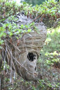 2. Bald-faced hornets make their home in football-shaped gray paper nests in trees and under eaves. Also, rarely in walls or attics.