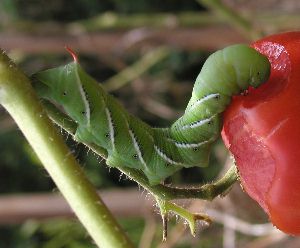 The tobacco hornworm, Manduca sexta, is usually much more common in vegetable gardens than the tomato hornworm, Manduca quinquemaculata, but both may be found together as they generally have similar habits.