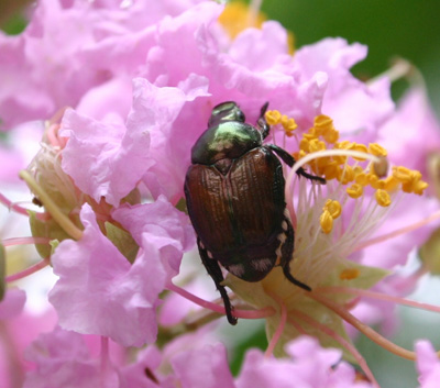 Most summers are favorable for Japanese beetles. The coppery-green beetles hatch in the lawn in June each year. Once they have emerged, the beetles head straight for their favorite plants nearby. The leaves of grapes, canna, loropetalum and flowering cherry look like lace doilies after the beetles have dined on them. The insects burrow into the center of rose and hollyhock blooms and rapidly ruin them.