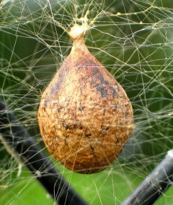 Yellow garden spider egg sac’s, are white to brown, and somewhat teardrop-shaped. Photo by Wikimedia Commons, user Joyous!, licensed under the Creative Commons Attribution-Share Alike 4.0 International, 3.0 Unported, 2.5 Generic, 2.0 Generic and 1.0 Generic license: https://commons.wikimedia.org/wiki/File:Argiope_aurantia_egg_sac.jpg