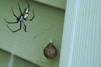 A female Joro spider may have as many as 1000 eggs in her egg sac when she constructs it in fall before she dies. The spiderlings hatch in spring and “balloon” themselves away by spinning a thread of silk, which catches the wind.