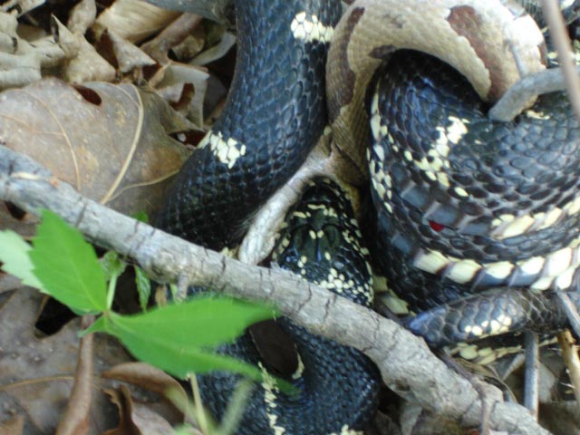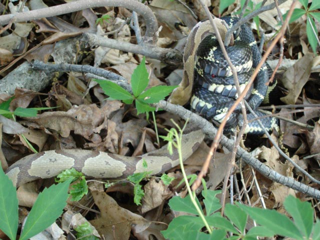 Within seconds of my return to my task, I heard all this commotion and thought the snake had ferreted out a chipmunk. I turned to see a snake fight instead. Within a matter of 2-3 seconds, the King snake had coiled itself around the Copperhead. The Copperhead was thrashing around violently, biting the King Snake with every head thrust, left-right-left-right, slam, slam, slam.