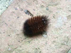 You can see the red rings around its body, which distinguish it from the common banded wooly bear caterpillar, which has a wide orange band in the middle of its body and which turns into an Isabella Tiger Moth, Pyrrharctia isabella.