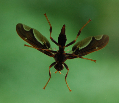 Q: What is this insect? It is on the outside of my window. It looks as if it may have a stinger but I have never seen anything like it.