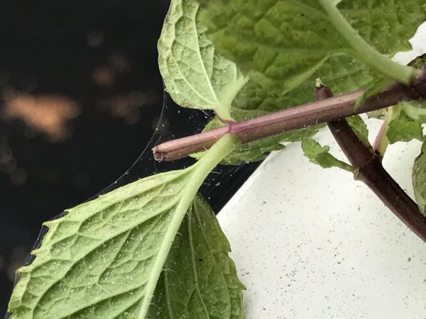 Q: I have been trying to grow mint indoors. I’m on my fourth plant! At the top of a few of the stems there’s a spiderwebby kind of thing with dots on it.