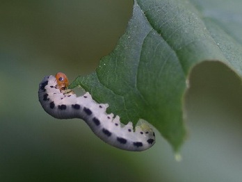 The creatures LOOK like caterpillars to the uneducated eye but they are not. A sawfly is a primitive wasp-like insect. The females have a saw-like blade at the tip of the abdomen that is used to cut slits into plant tissue into which they deposit eggs. The resulting larvae, since they are not caterpillars, are not affected by the organic caterpillar insecticide, B. t. (Dipel, Thuricide, etc)