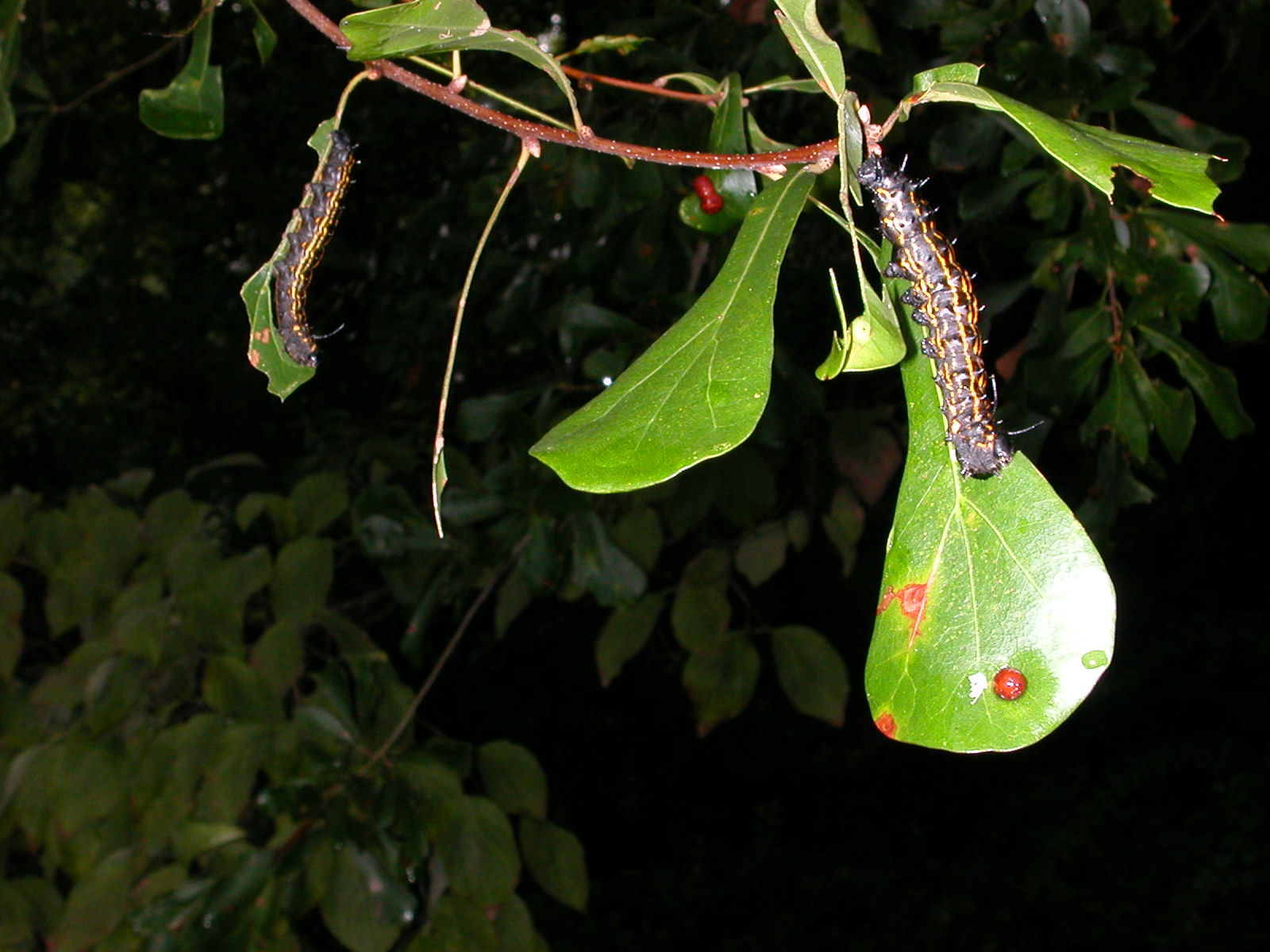 If the fecal pellets are objectionable, an organic control works well. Bacillus thuringiensis (B.t.) (click for sources) is a disease spore sold as Dipel, Thuricide, Caterpillar Attack, etc. This spore is harmless to mammals and birds but it causes caterpillars to stop feeding as soon as they ingest it. After a few days, dead caterpillars will hang limply from the formerly disappearing leaves.