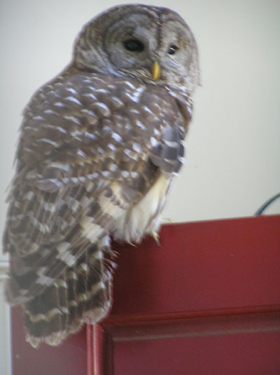 Q: I had an owl get in my house one night via an open fireplace flue. We aren’t sure how the owl got the glass doors open over our fireplace. Somehow it got out and it flew from the downstairs den into the foyer. It then went into an upstairs bathroom and landed on the shower curtain rod. We closed it in that room until we could make an escape plan for it.