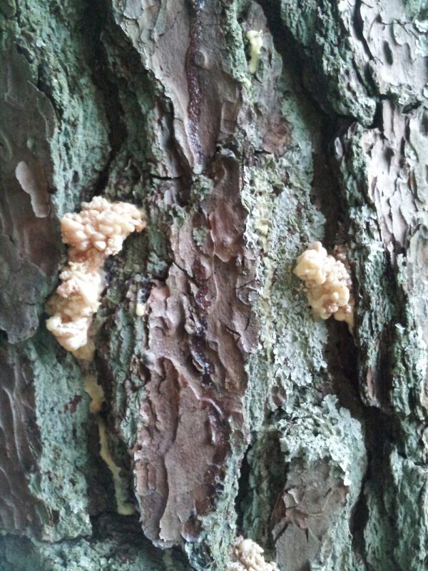 Q: Can you identify what the goo is oozing from the trunk of a pine tree in my backyard? I would hate to have to remove the tree.