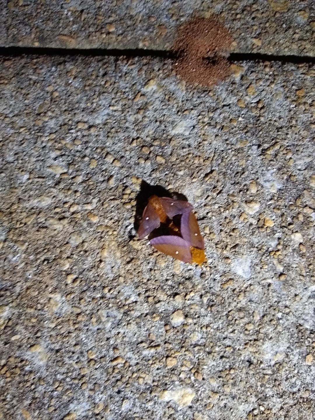 Q: Found these two on my walkway one evening. Thought it was a small frog then noticed the purple and two sets of eyes as they moved slowly. Nose appears large for size.