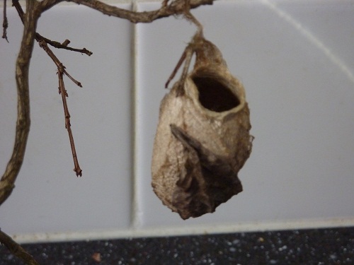 This looks to me like the cocoon of a giant silkworm moth (family Saturniidae), and I’m thinking specifically that this is either a Polyphemus moth (most likely) or a Luna moth. The Polyphemus moth is the one likely to leave the pupa out in the open attached to a plant. Sometimes they will also spin their cocoons in the leaf litter, which is where the Luna moth spins its cocoon also. So since this was left on the tree it is most likely a Polyphemus moth (Anthraea polyphemus), and the opening on the top means that the moth has already emerged and flown away.