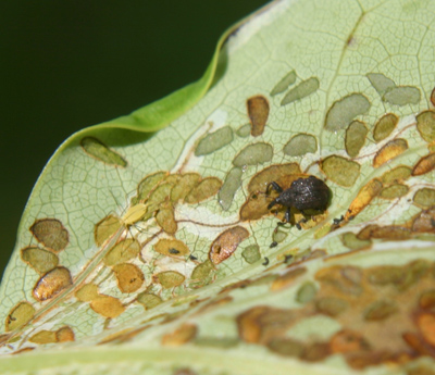 A: It’s damage from the poplar weevil, a small “snout beetle” that feeds on poplar and sassafras leaves. The population varies greatly from year to year. It has been ten years since I noticed a heavy infestation.