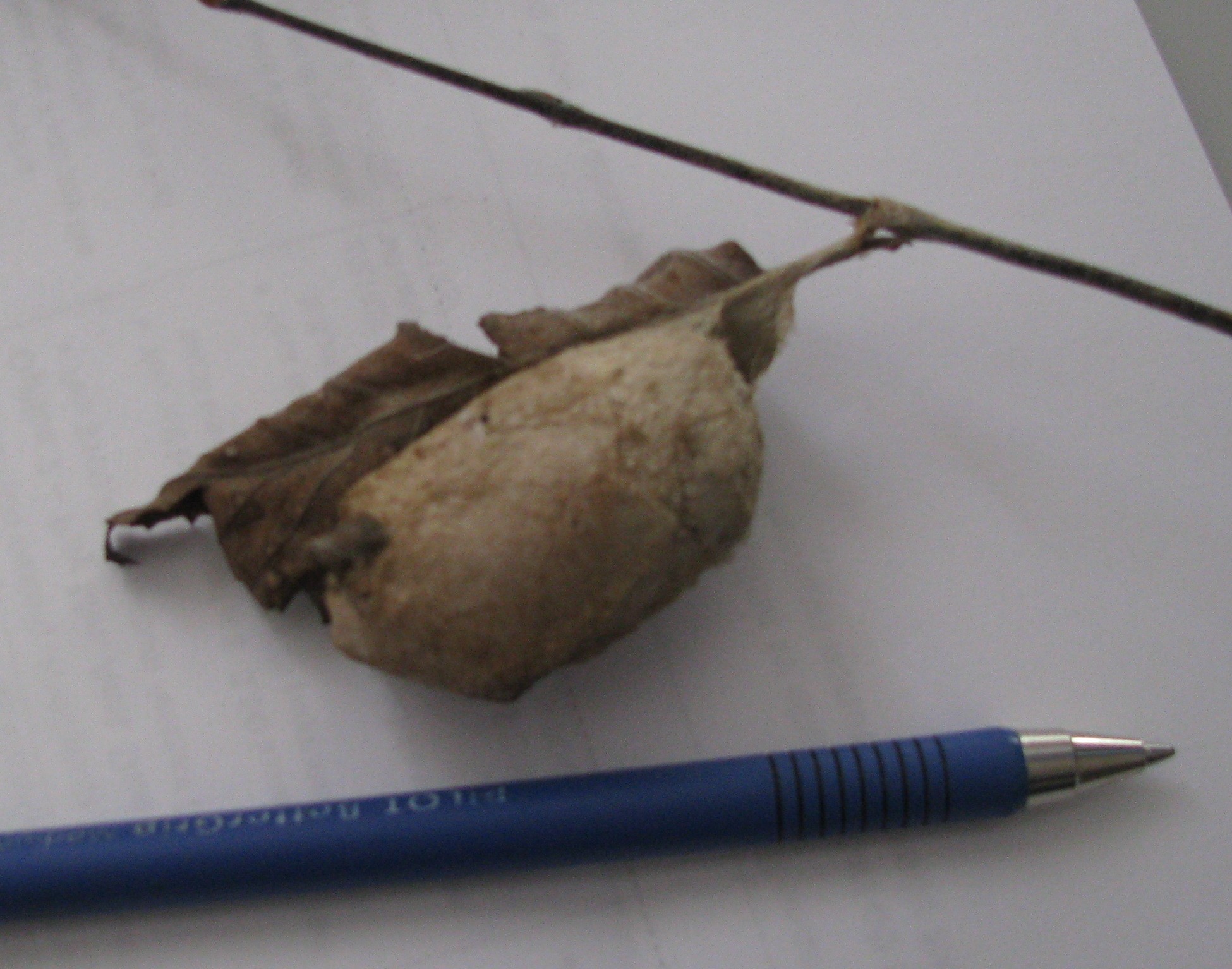Q: In February I found a strange tent-shaped attachment on a stem of my tulip tree (saucer magnolia). It is brownish and feels like Styrofoam but it will not peel off from the stem.