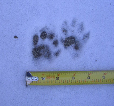 A: Let’s do some eliminating first: they’re not dog or cat tracks because those animals have only four toes that touch the ground and I see five distinct toes in your pictures.