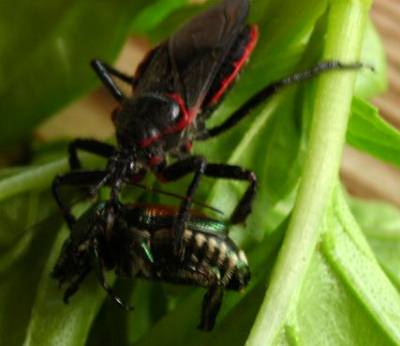 A: My bug sleuth friend Lisa Ames says it is a Rhiginia cruciata – Scarlet-bordered Assassin Bug.