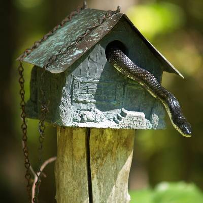 Q: I can see a birdhouse from my kitchen window and thought I had a leaf hanging out of it. Then I noticed a squirrel raising cane near it and saw that the leaf was getting longer. It was a snake!
