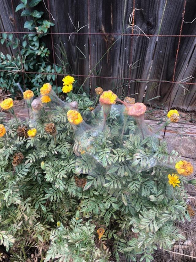 Be cautious about planting a marigold in this spot next year, since it is so common to have spider mite problems. Choose another annual flower instead.