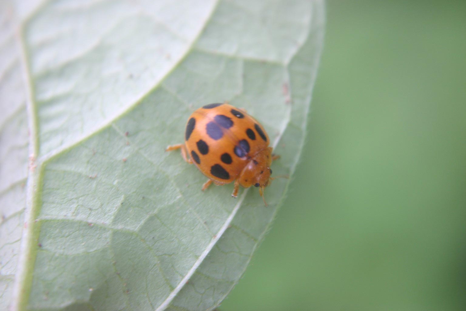 Note that there is a similar insect called the Mexican bean beetle, Epilachna varivestis. This insect has 8 spots on each wing cover rather than the 7 you see here.