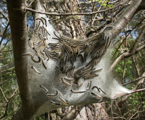 No control measures are really necessary unless the webs mar the landscape or the caterpillars are dropping onto a deck. Destroying the “tent” exposes the critters to birds, weather and other predators. An organic pesticide containing Bacillus thuringensis (abbreviated “B.t.”) will kill many worms and stop their feeding. Some commonly available products are Thuricide, Dipel, and Caterpillar Attack.