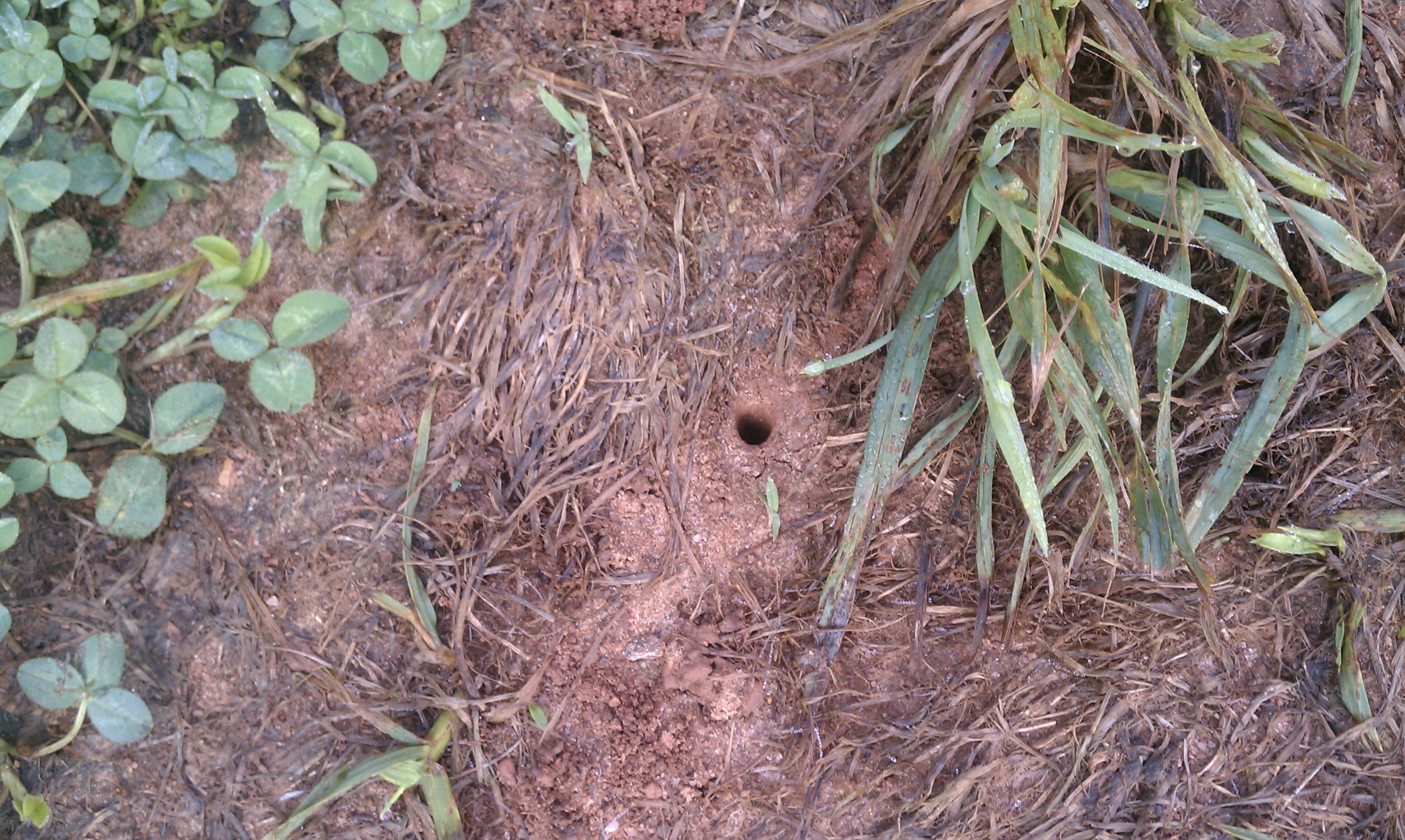 Q: We found this interesting bug in our yard. At first we thought it was a snake that was just sticking its head in and out of a hole, but in looking closer we think it is some sort of bug. It lives in a hole that is about 1/2 inch across with no castings of dirt around the entrance. The bug sits in the hole and quickly moves away when it senses something is near.