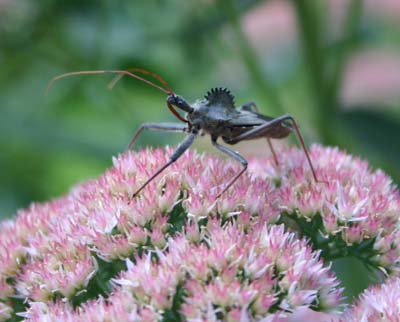 A: I think your husband and his buddies found a wheel bug. They are indeed fearsome-looking. Wheel bugs are members of the beneficial assassin bug clan. They normally prey on aphids, bean beetles, sawflies and sometimes lady beetles.