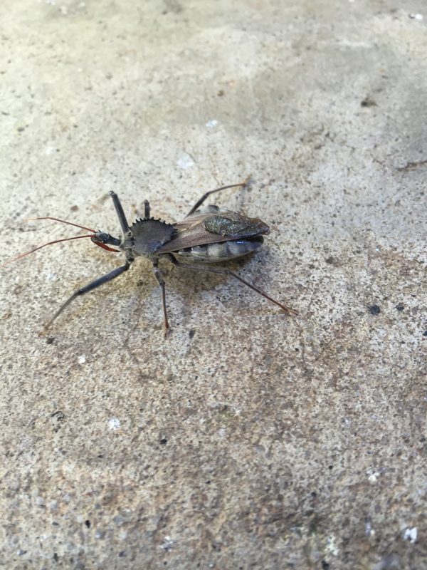 Wheel bug saliva contains a poison that kills its insect victims but their mouth is big enough to inflict a painful bite on human skin too. If your husband gets bit, he will holler like a struck dog!