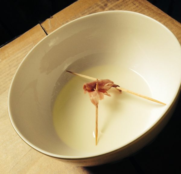 Roll the meat into a tube and spear it with three toothpicks to make a tripod to support the meat.