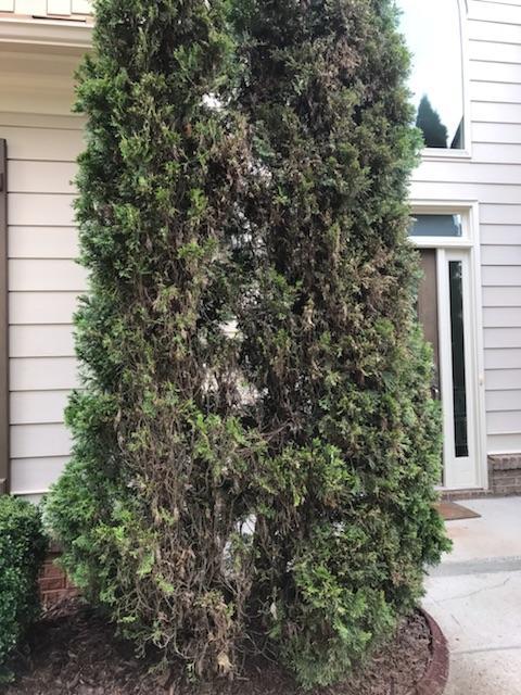 Q: We have two large arborvitae’s at our home’s front entrance. Last night I was standing near one of them and heard a noise. When I looked at the bush, it was moving! Upon closer inspection my husband found the lower front section to be covered in bagworms. They have not made it to the top or even all the way around the tree yet. What can I do to bring the tree back?
