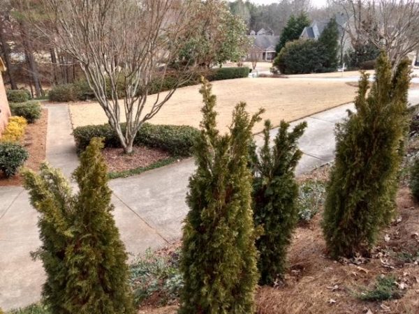 Q: During the December snow storm our arborvitaes were damaged. The tops are split and leaning over. Originally the tops were together and nicely pointed. Is there anything we can do to repair the damage?