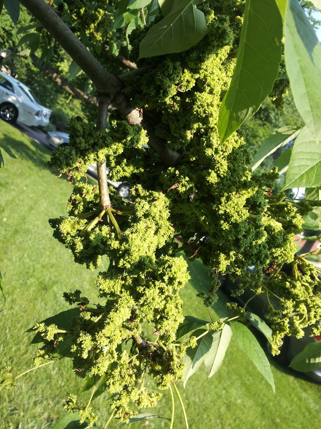 Q: I have a white ash that has weird green cauliflower-looking growths where the seeds clusters used to be. When I break them open, I find a little worm.