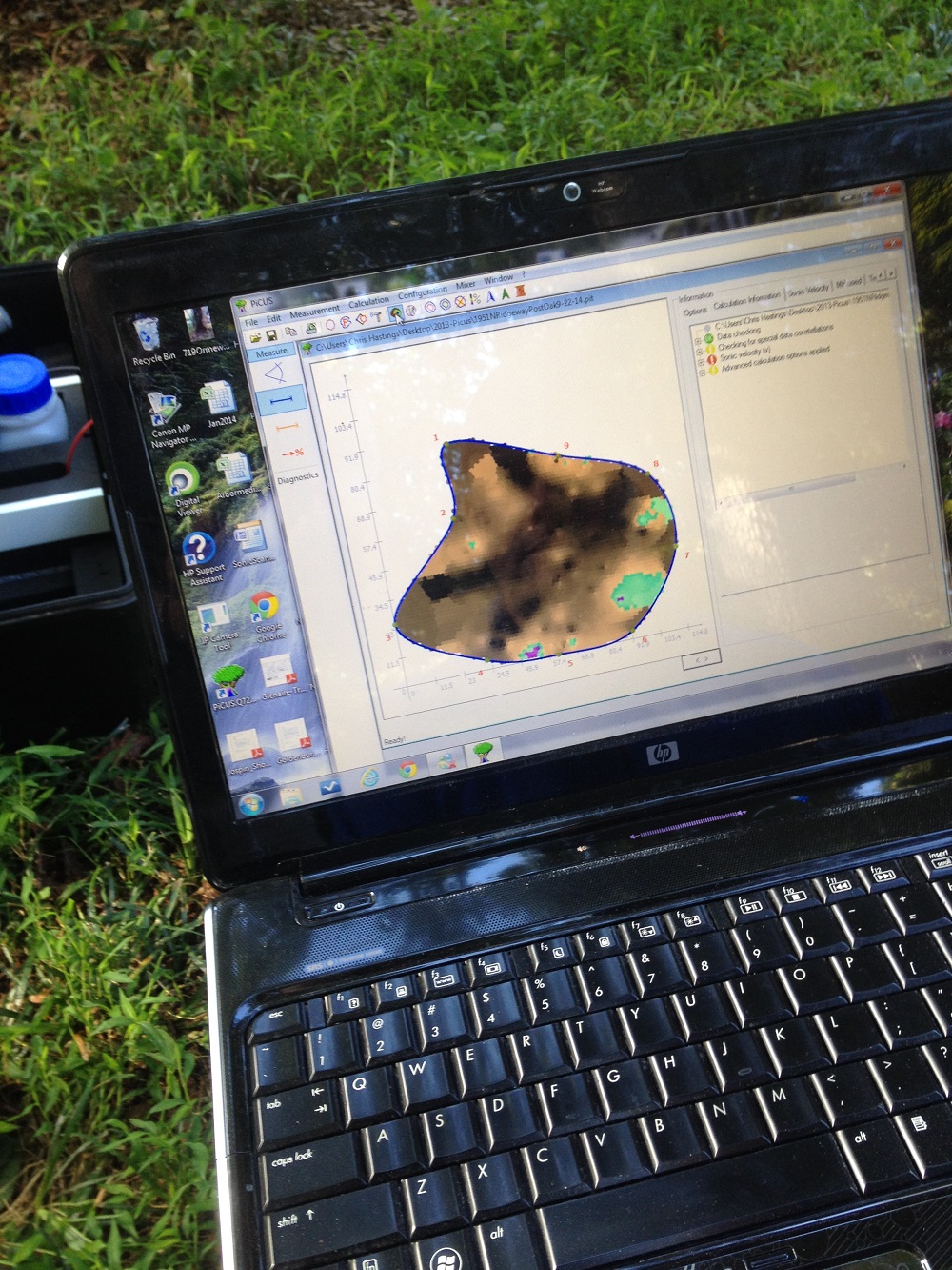 He drives short metal pins into the trunk and taps them sequentially with a special hammer. The computer “listens” to the sound as it travels through the trunk from side to side and determines where there is sound wood and where there is rot.