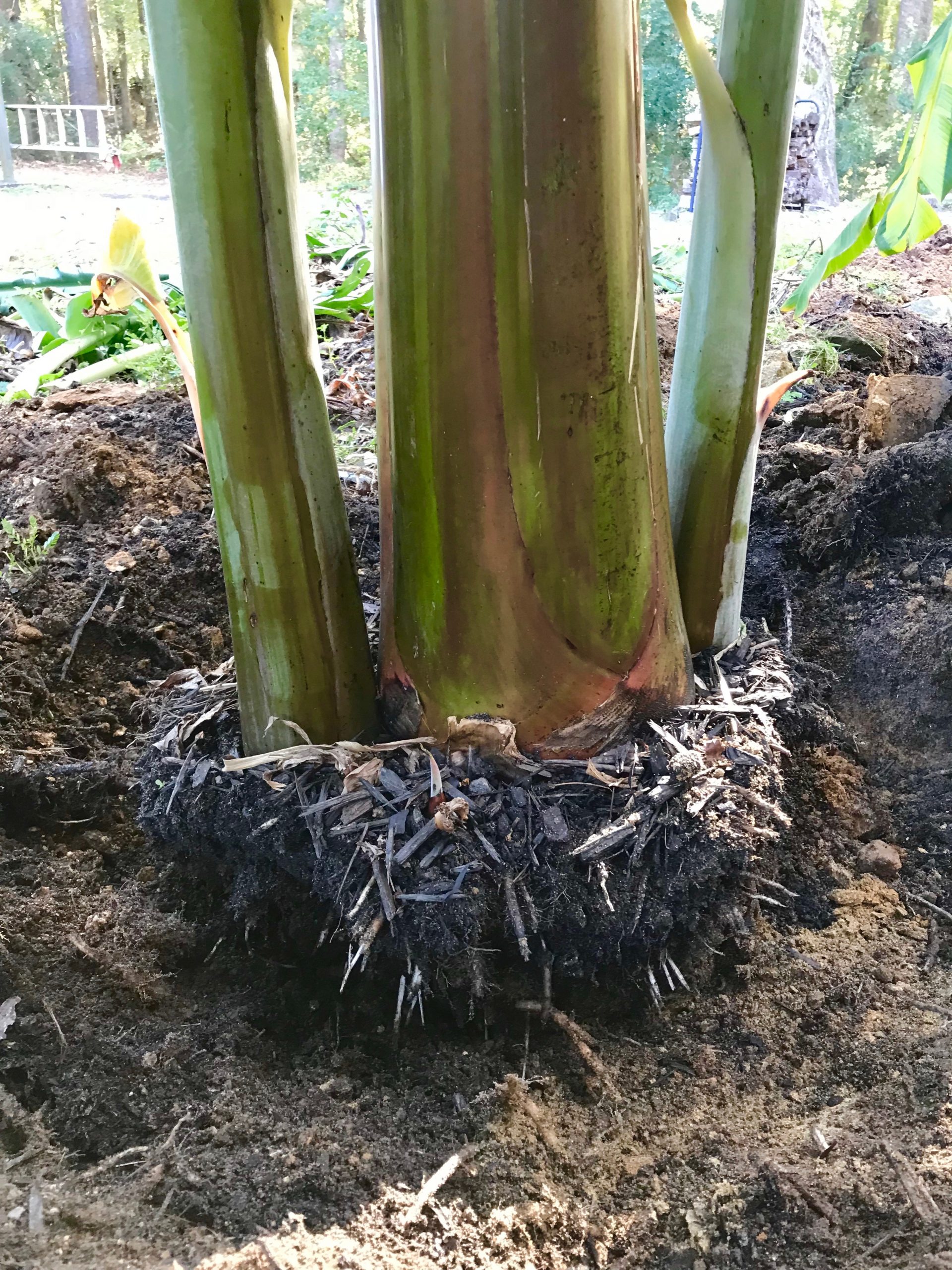 Ok, now the food. Bananas need lot to eat…A LOT! I always use composted cow manure and lots of black mulch before I put down any chemical fertilizer. I mix the planting hole with about half composted cow manure, half native soil, with some decomposing leaves if I have any around. If it’s a new planting spot, I make sure to fill the hole with water to test and see how fast it drains before I do all the work. If it doesn’t have decent drainage, the corm will rot. Once planted, I add as much composted cow manure as a top dressing as I can. I try not to have too much composted cow manure touching around the pseudostem. After the cow manure top dressing, I add lots of dyed black mulch because the color of the mulch heats the soil/roots more and retains the heat longer overnight in the spring when the nights are still cool. About 3 times a year I’ll pull back the mulch and top-dress again with composted cow manure as it breaks down. It will turn a light gray color when it’s time to add more. You could probably add more every week and they would love it.