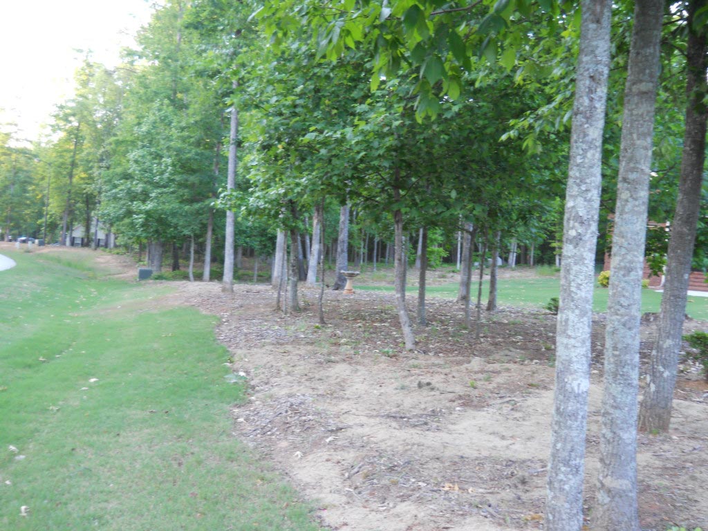 My personal preference is to cover spots like this with pine straw or chips and then make a weekly weed-killing visit with a spray bottle of Roundup.