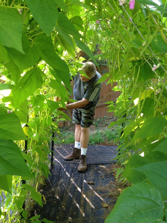 A: Very nice! My Athens friend Bill Merka used concrete reinforcement wire panels to make a curved-top bean house. He could easily stand up in it and pick the beans that hung down.