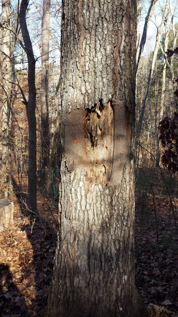 Q: A few years ago this totally healthy oak was struck very hard by another falling tree. Eventually a wound developed. I decided to cut it down for safety of my home. However as you can see in the pictures, there was a ring inside the tree of a gelatinous material as well as a white spongy material. Was this a disease? or from the injury?