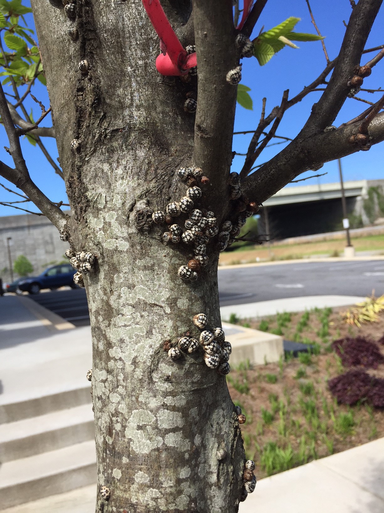 Q: Any idea what these black and white things are? They are on the trees along a front walkway near Atlantic Station.