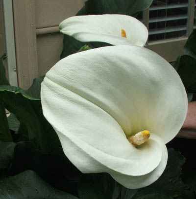 A: Wow!! I think you have the big white calla, Zantedeschia aethiopica. This is an example of how a plant can be gloriously happy in one spot (your yard) and a miserable failure in another (my yard).