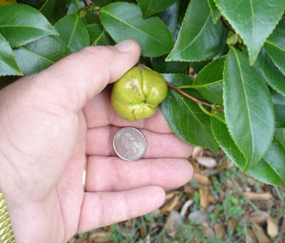 Q: I have two camellias that have been in my family for over 60 years. One of them has always produced an occasional fruit. This year there is a large crop of 10 or more.