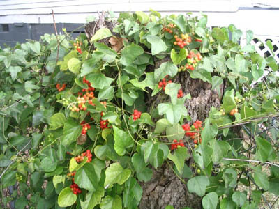 Q: I have noticed an interesting vine growing on a fence near my house. It has bright red berries hanging in clusters from the stem. The leaves look vaguely like smilax or large-leaf vinca. Do you know what it is?